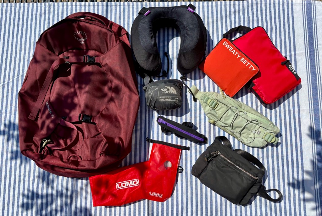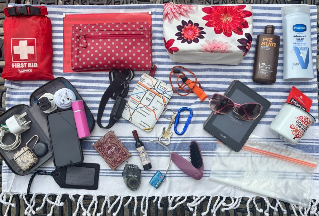 - Essential items and valuables in a small bag: wallet, cards, passport, GHIC (Global Health Insurance Card), phone, headphones, ear loops, travel insurance documents, car/house keys.