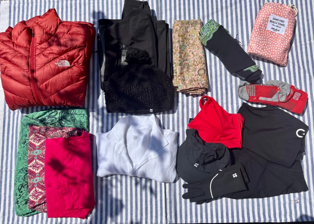 - At least one pair of light-weight pair of trousers – sometimes it’s cold – sometimes you have to cover your legs due to culture or religion