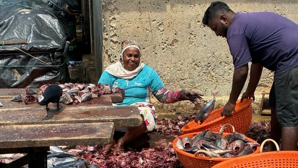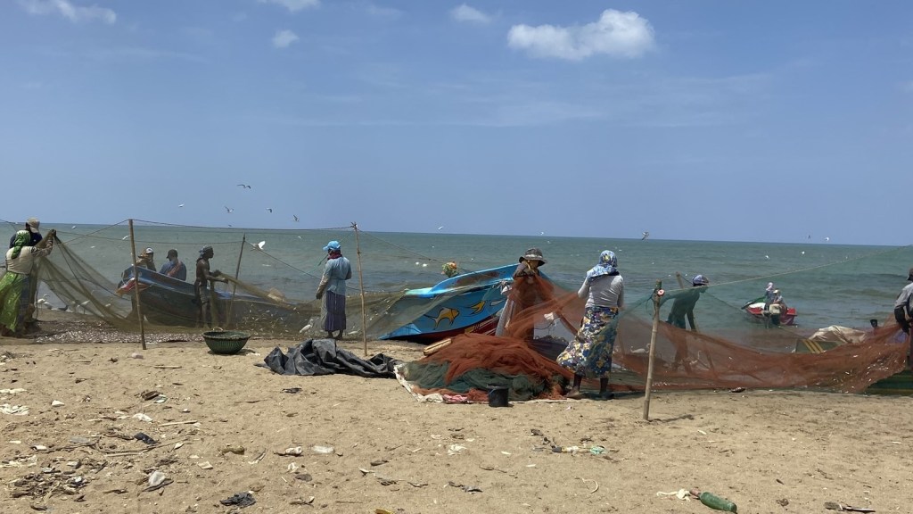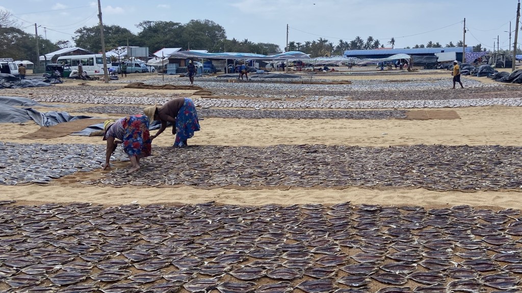 Around the corner, row after neatly aligned row of fish lie drying in the sun. Each row represents a different family’s catch. Every two hours, women work systematically along the rows, turning the fish. The dried fish are finally boxed and sold locally and form the basis of fish curries, rather than relying on expensive fresh fish.