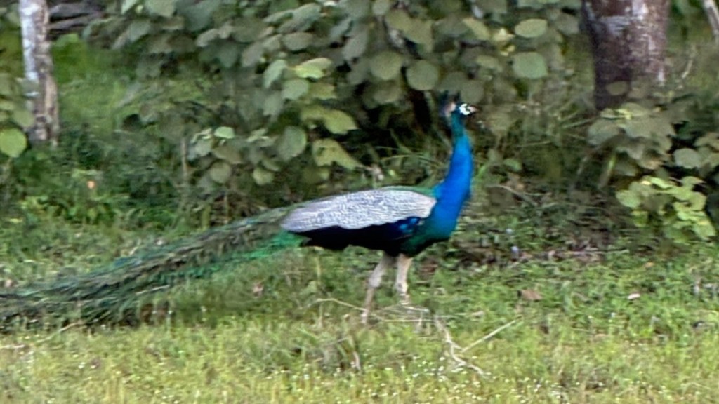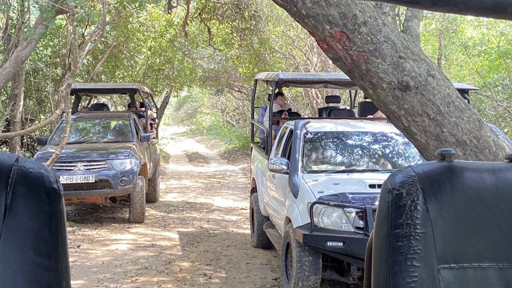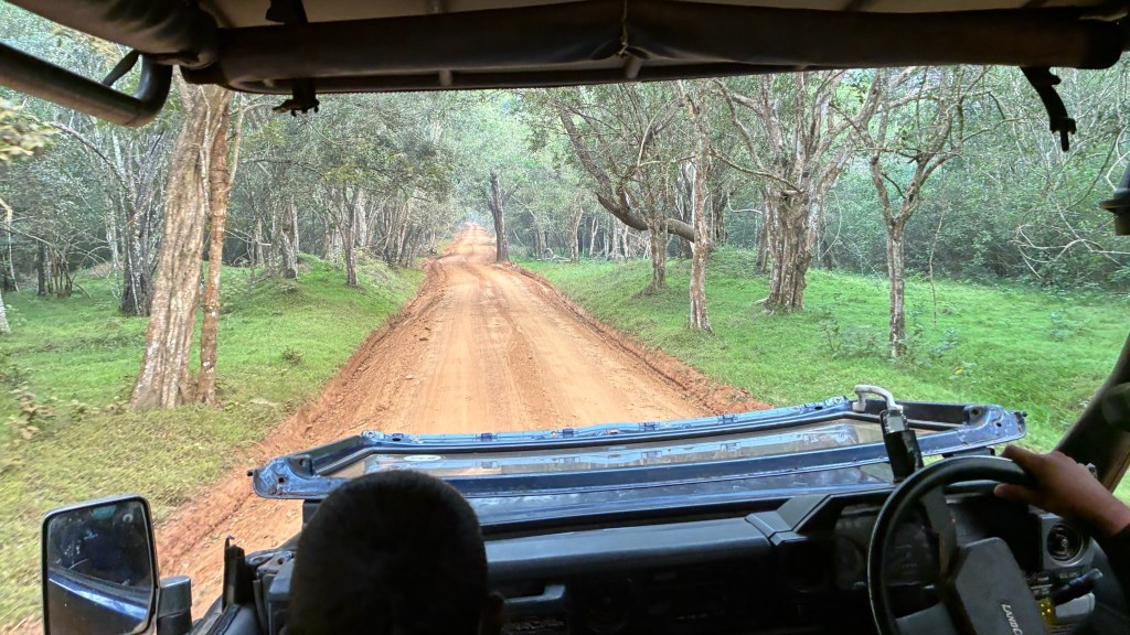 Wilpattu safari took resilience and grit determination to survive. We started early, meeting in the compound at 5.30am for the short ride onboard our safari truck to the National Park with another couple, full of anticipation for the day ahead. The park opens at 6am, so we sat in the queue of trucks in the pitch dark, waiting to go inside. The trucks are sturdy, old, and jolt your body in ways you never thought possible. At the start of the day, this feels fun, you like the thought of going ‘off-road’. This feeling lasts until about 10am. Our guide was a chirpy 19 year-old who knew the names of the animals we saw – but little else – so we stopped asking questions about the size, scale etc. In the first hour as the sun came up we saw birds of prey, owls, pretty deer, mongooses, peacocks sat high in trees and a brightly coloured ‘Sri Lankan junglefowl’ that we nicknamed the ‘chicken’. The truck, expertly driven, navigated dirt roads and ditches, throwing us side-to-side against the metal sides as we eagerly hunted for an elephant or a leopard – the holy grail of this safari.