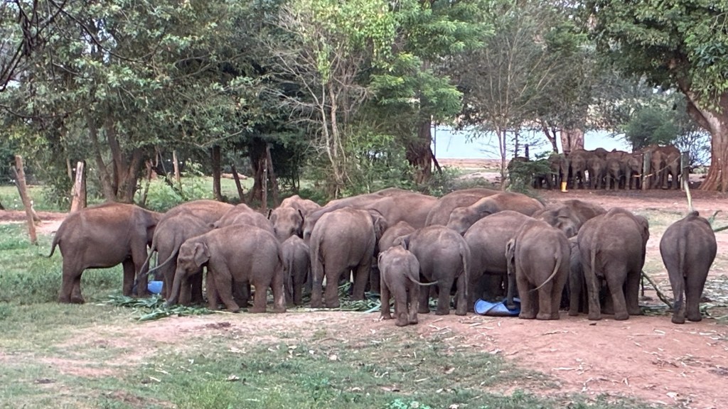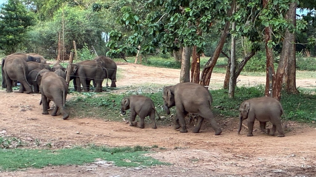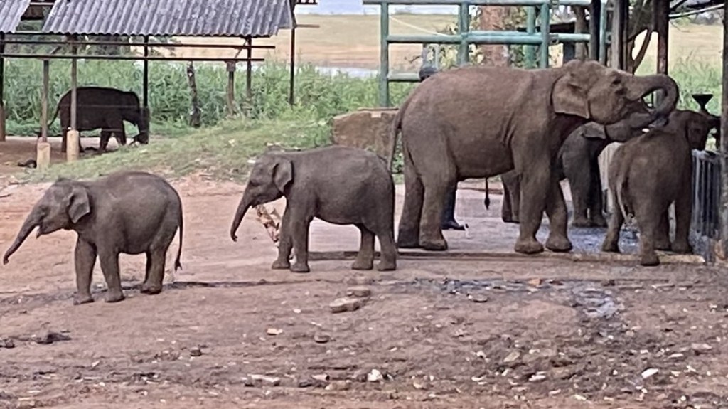 You can only go in to view them during feeding times – 10.30, 2.30 and 6.00 – for a small fee. You watch from a distance, as they are allowed into the feeding area two or three at a time. They run to the ‘milk station’ to drink and then move across to eat sweet corn. Some are quite big, some very tiny and there are loud squabbles and disputes as some try to get extra helpings, barge each other or push the little ones out of the way. One man manages all of this, with a stick. He walks amongst them, ensuring everyone gets the correct amount, lifting the stick sometimes, sometimes tapping their behind. One confident ‘teenage’ elephant, already having had his fill, kept sneaking up behind the man, a bit like a game of ‘Mr Wolf’, getting told off but finally managing to grab a trunkful of extra milk from the bucket. There is a choreography to this…milk, then corn, then back out into the national park. Subsidised by the government, who have now declared elephants endangered in Sri Lanka, each person who visits, pays for one elephant’s milk for one day. Clearly at some point, it will be marketed to make it more sustainable – t-shirts, bags and the like…But its simple set up is perhaps what makes it so endearing. Extraordinarily magical and emotional. We went three times!